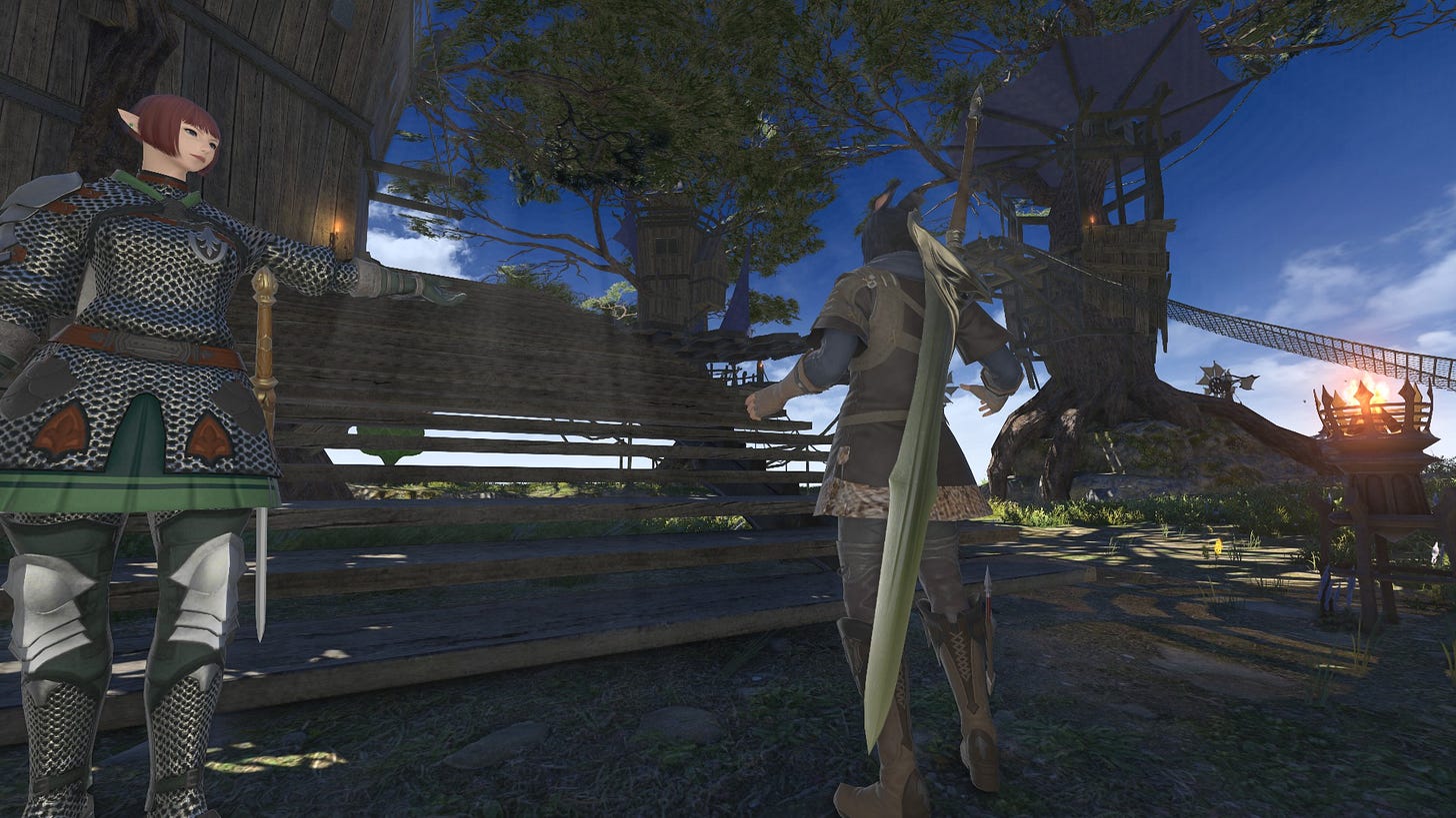 I stared up at the large treehouse, the oversized netting, and the wood stairs that gave access to a network of lookout places above us. At a hut below we approached a young blonde female Elezen.